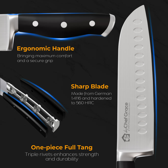 - Full Tang and Ergonomic Handle: The blades comprise of triple-rivet handles designed for a secure grip and are ergonomically shaped to provide added comfort during extended periods of food preparation