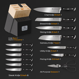 8” Chef Knife, 8” Bread Knife, 8” Carving Knife, 7’ Santoku Knife, 5” Utility Knife, 6* 5” Steak Knife, 3.5” Paring Knife, Scissors