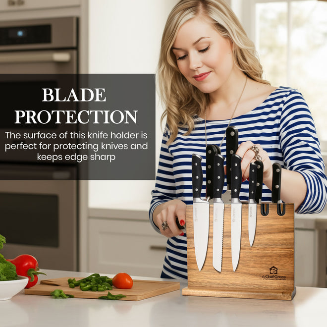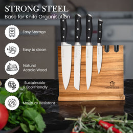Sustainable and Eco-friendly product. The block material is made of Acacia wood, which is a natural and high-quality wood. Moisture Resistant - acacia wood naturally handles kitchen humidity