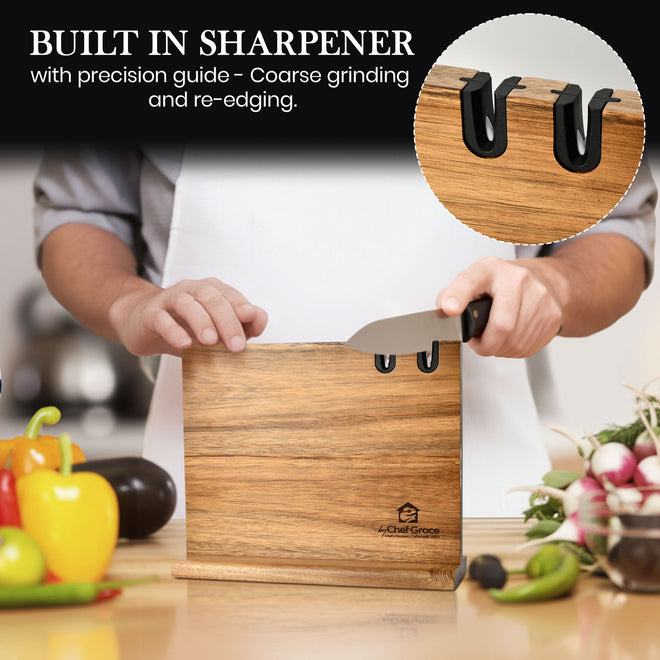 Built in Sharpener with precision guide - coarse grinding and re-edging. Our Knife holder is also equipped with Blade Protection technology making the surface of this knife holder perfect for protecting knives and keeping its edge sharp.